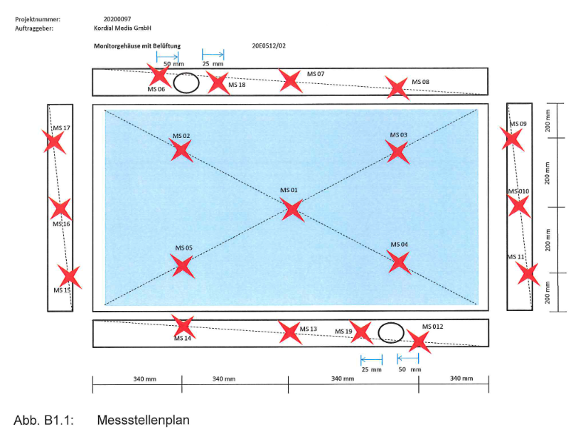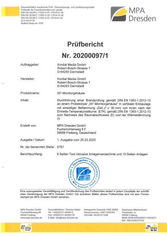 “Durchführung einer Brandprüfung gemäß DIN EN 1363-1:2012-10 an einem Probekörper „55″-Monitorgehäuse” in vertikaler Einbaulage mit einseitiger Beflammung (Zeit „t” ≥30 min) von innen nach der Einheits-Temperaturzeitkurve (ETK) gemäß DIN EN 1363-1:2012-10 zum Nachweis des Raumabschlusses (E) und der Wärmedämmung (I). […] Der Raumabschluss gemäß DIN EN 1363-1′ an der Oberfläche des Probekörpers wurde bis zur 36. Versuchsminute gewahrt. An der Probekörperoberfläche traten zu keiner Zeit entzündliche Gase aus. Nach 36 Versuchsminuten wurde die Brandprüfung beendet.“